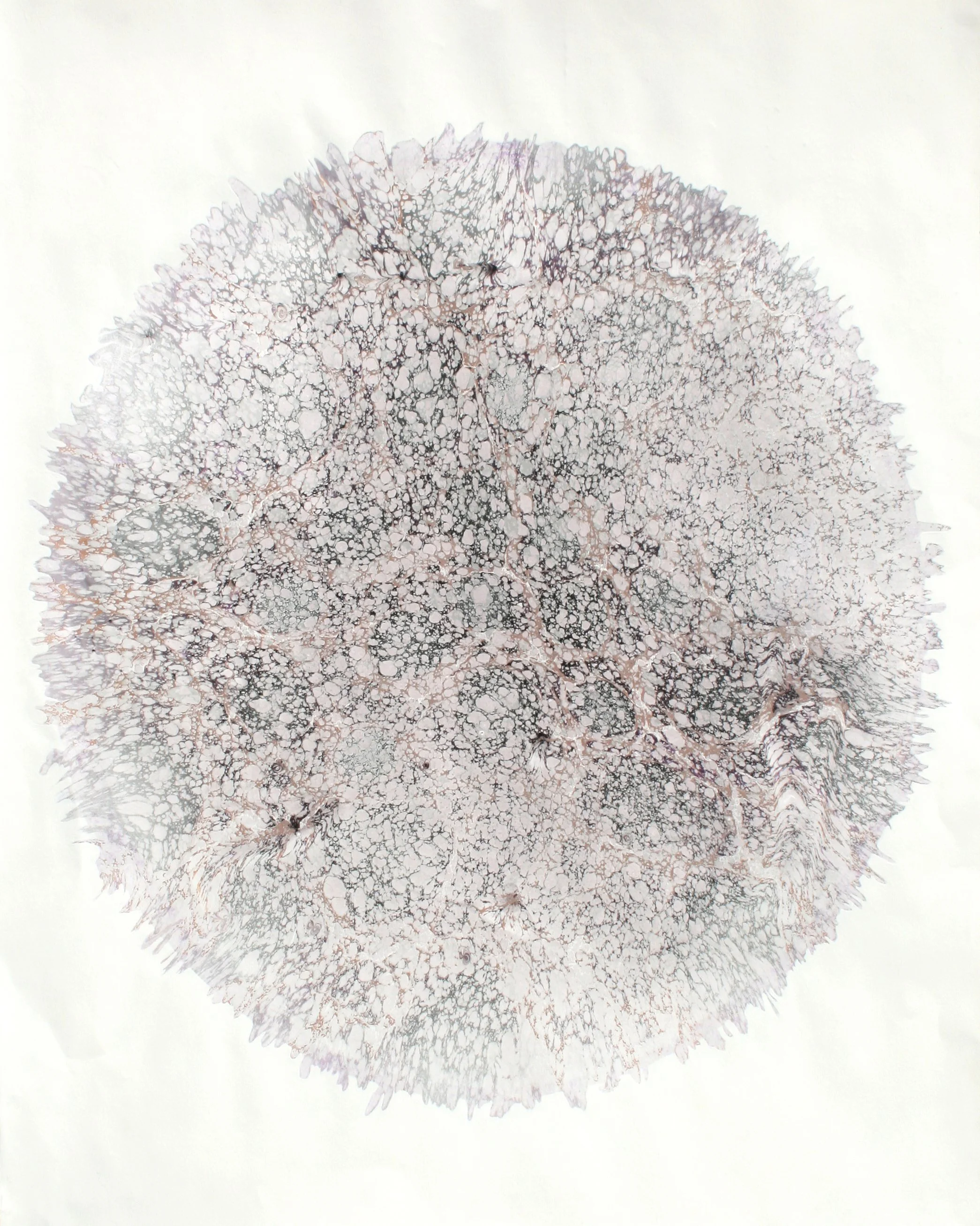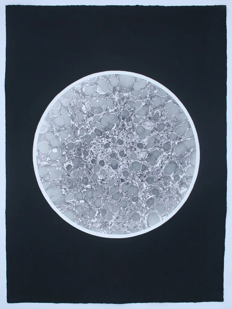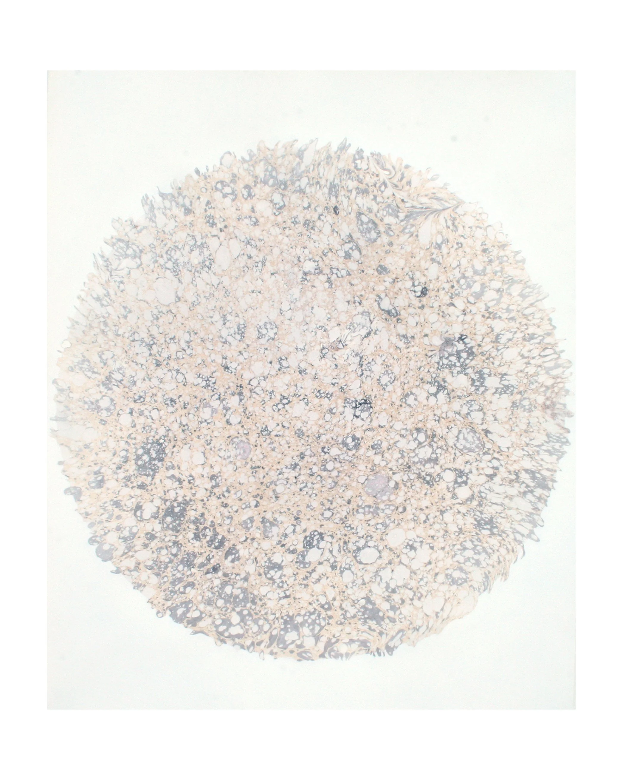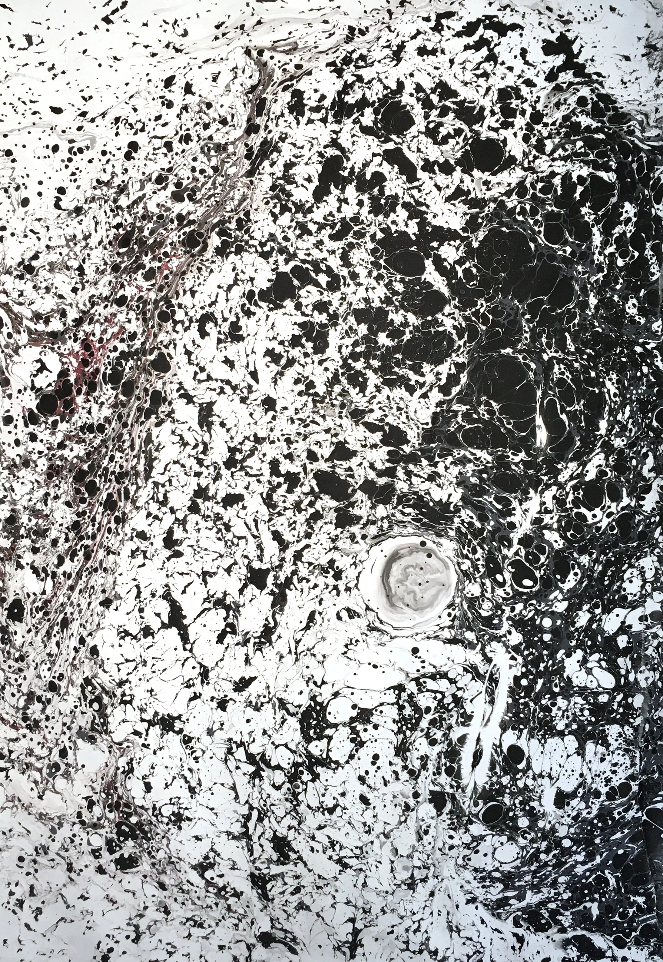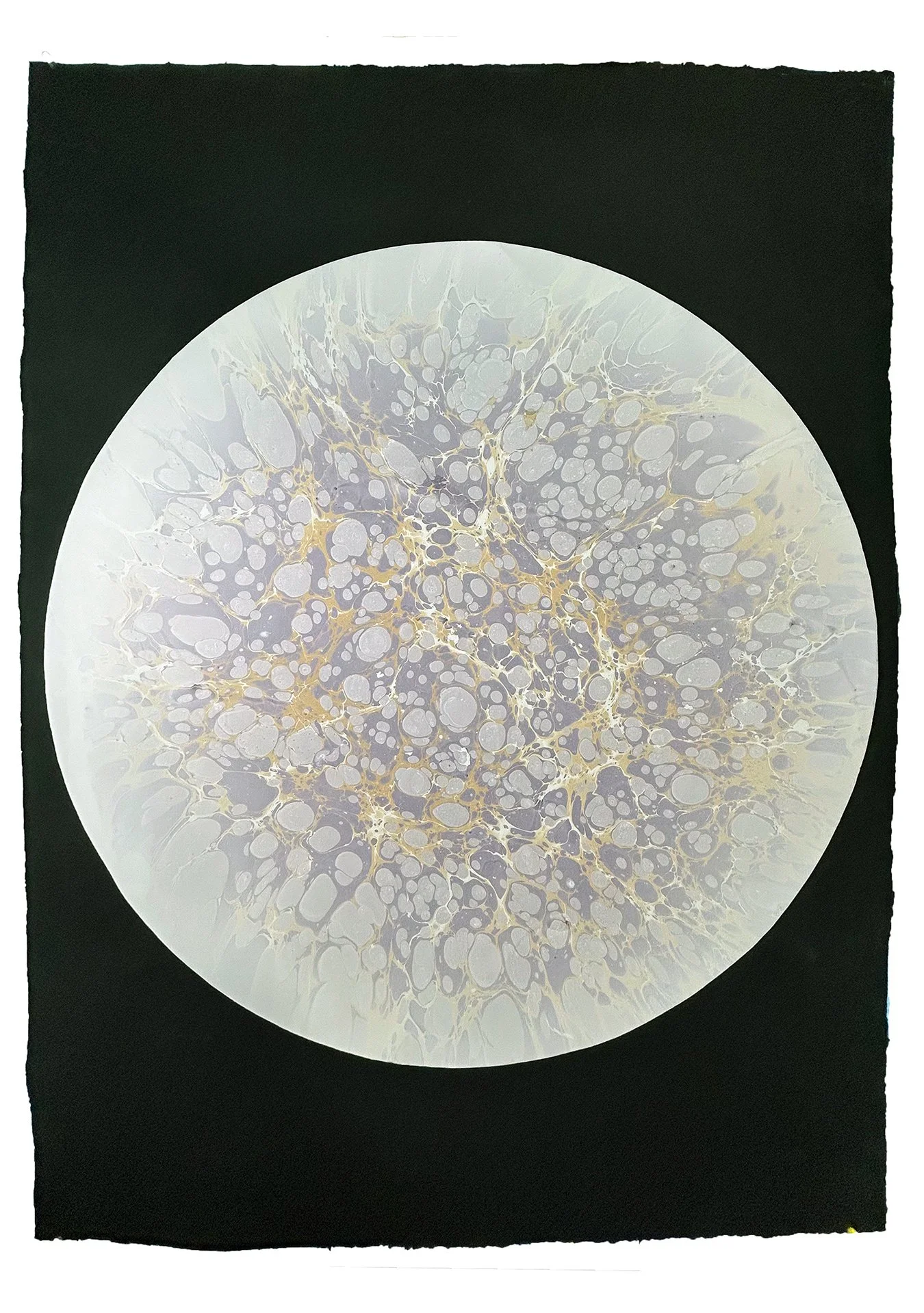 Julie’s work combines materials and methods from eastern and western marbling traditions, dating from the 12th century, with western approaches to painting. Water, pigment, and breath are used to create each work. The process begins with drops of acrylic paint on a liquid bath. The paint is induced to spread, move, and fragment by successive layers of paint and surfactants. The “floating painting” is then transferred to paper, and the final pieces are painted, and sometimes torn, cut and recombined.
