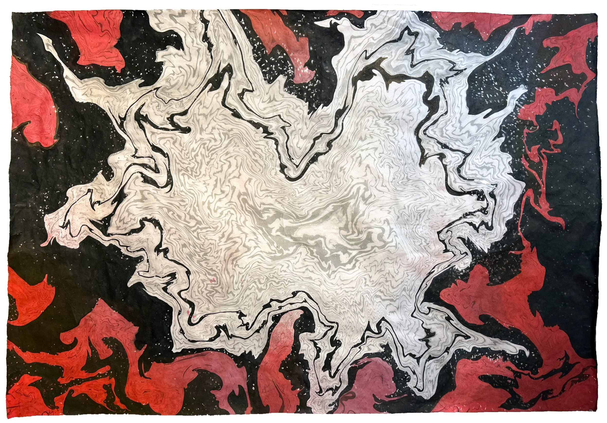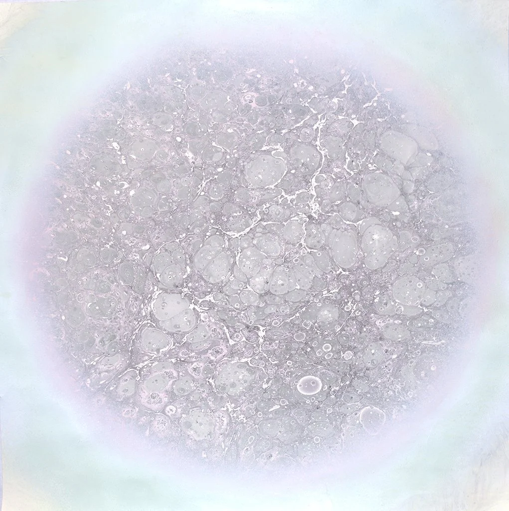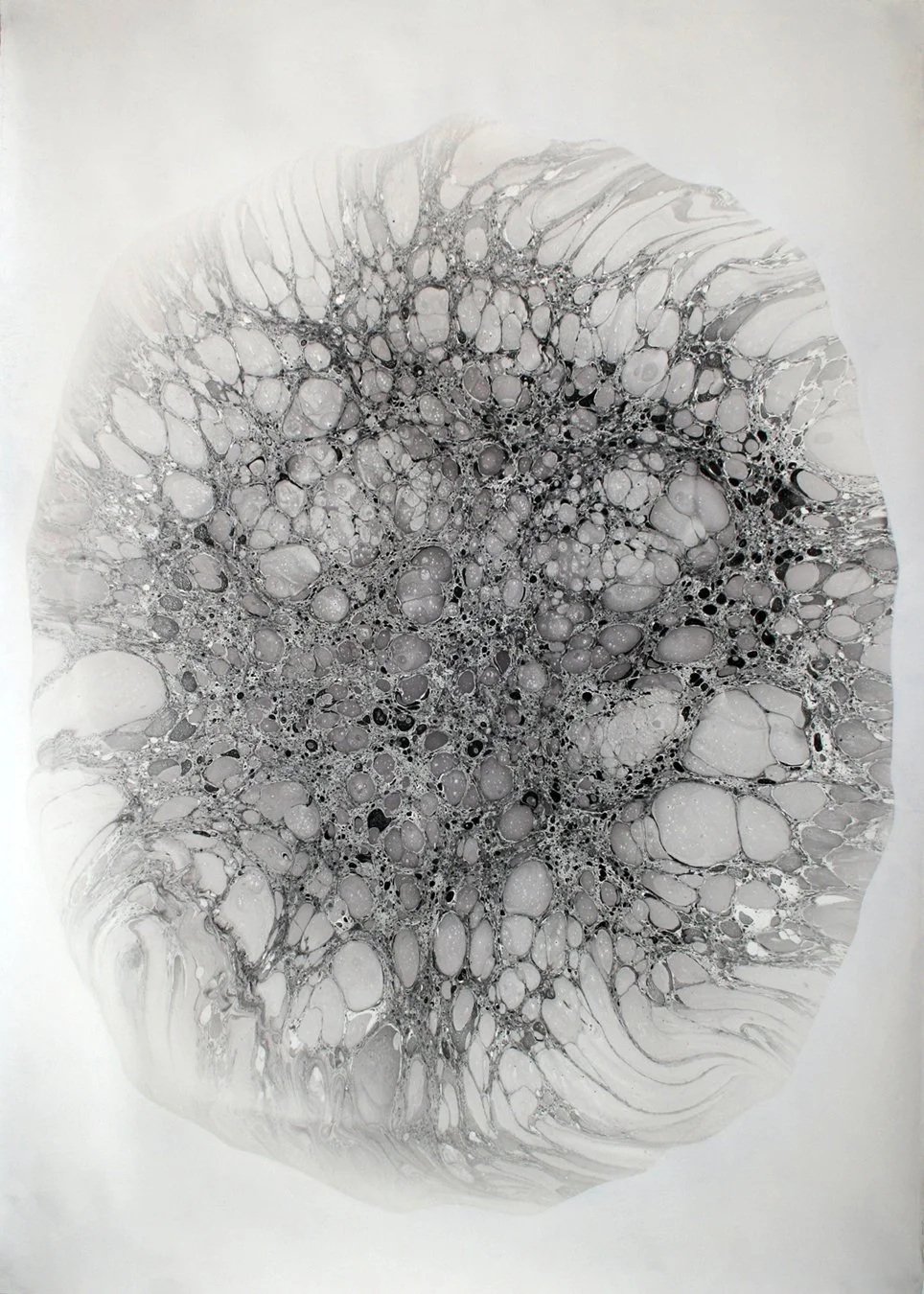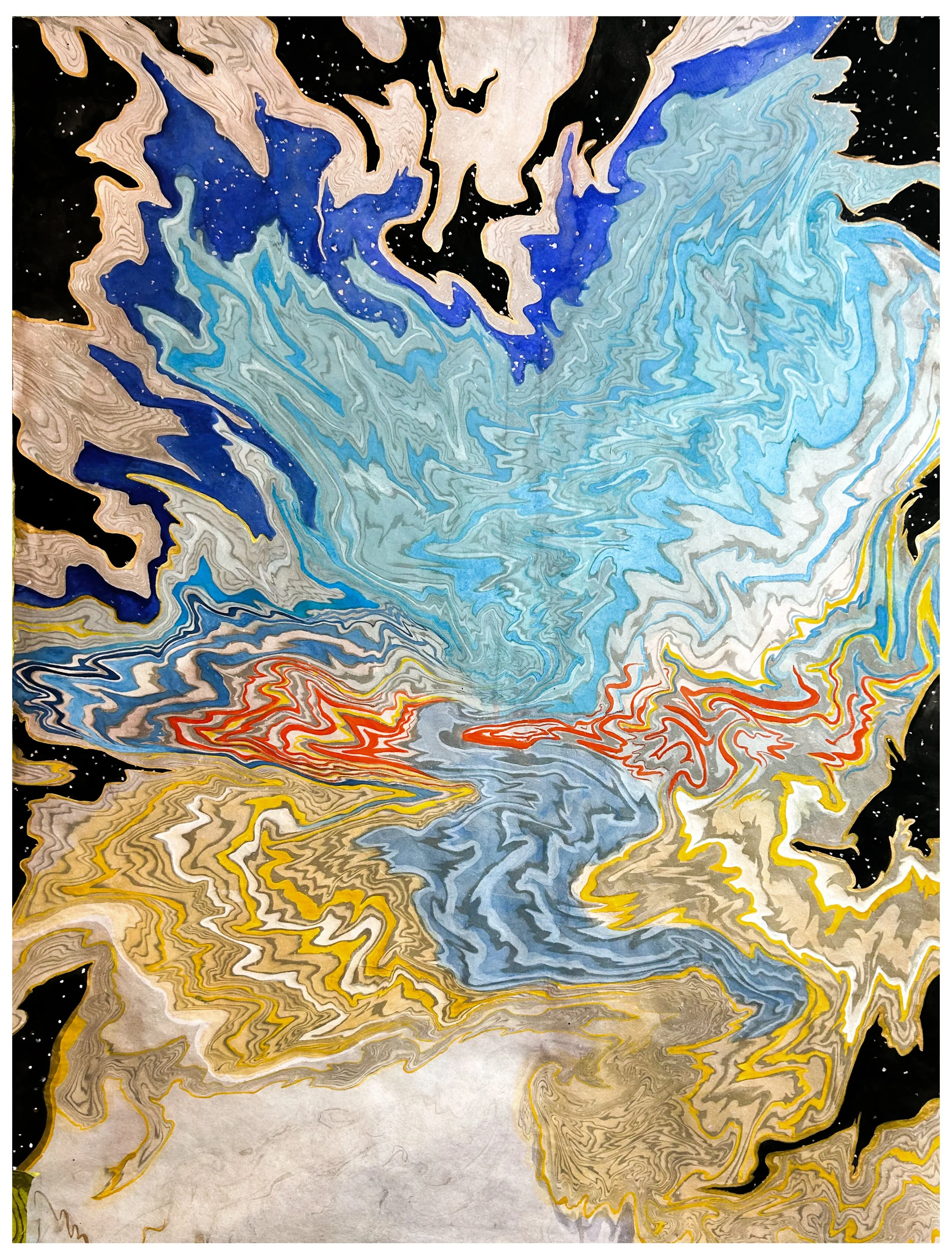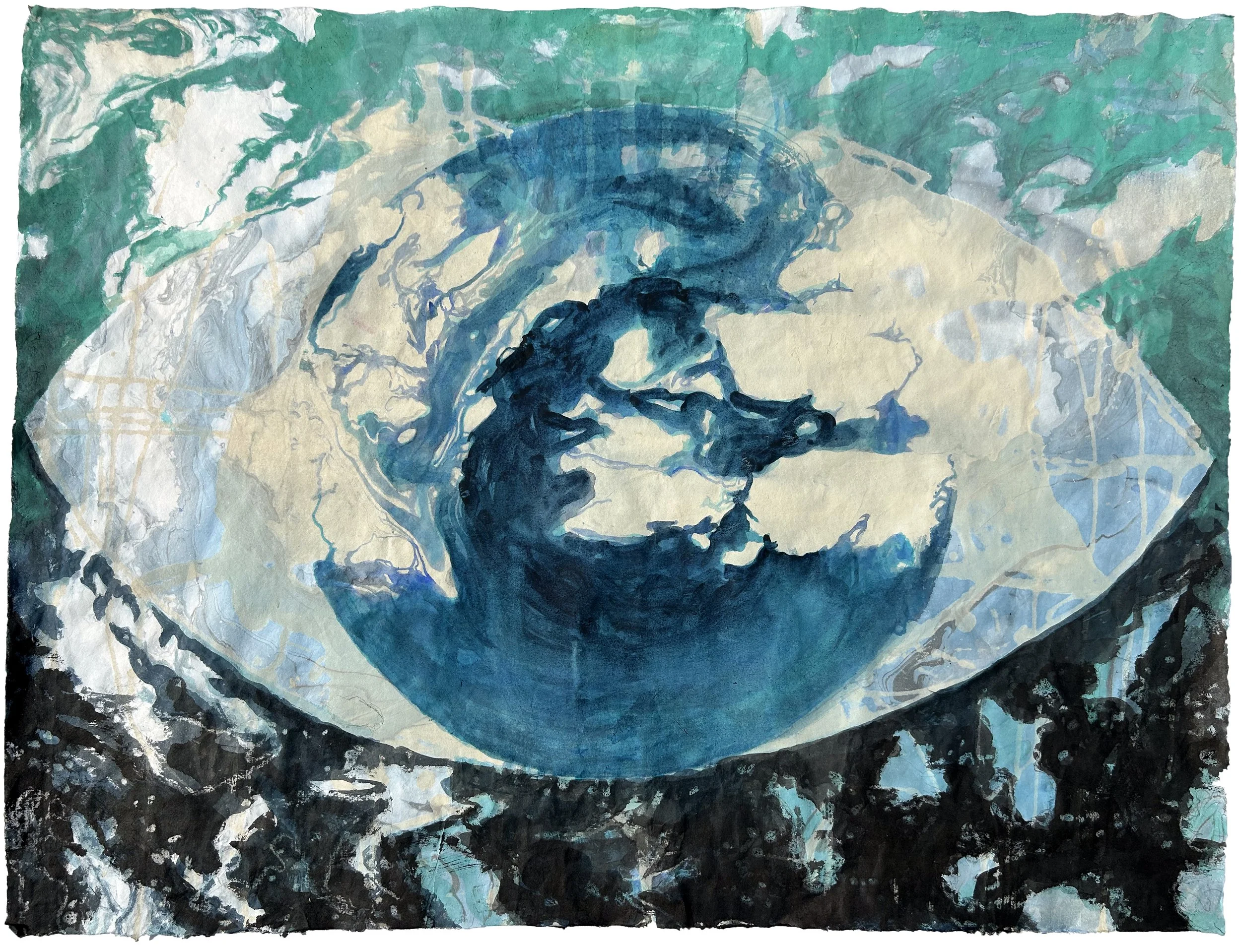 Julie’s work combines materials and methods from eastern and western marbling traditions, dating from the 12th century, with western approaches to painting. Water, pigment, and breath are used to create each work. The process begins with drops of acrylic paint on a liquid bath. The paint is induced to spread, move, and fragment by successive layers of paint and surfactants. The “floating painting” is then transferred to paper, and the final pieces are painted, and sometimes torn, cut and recombined.
