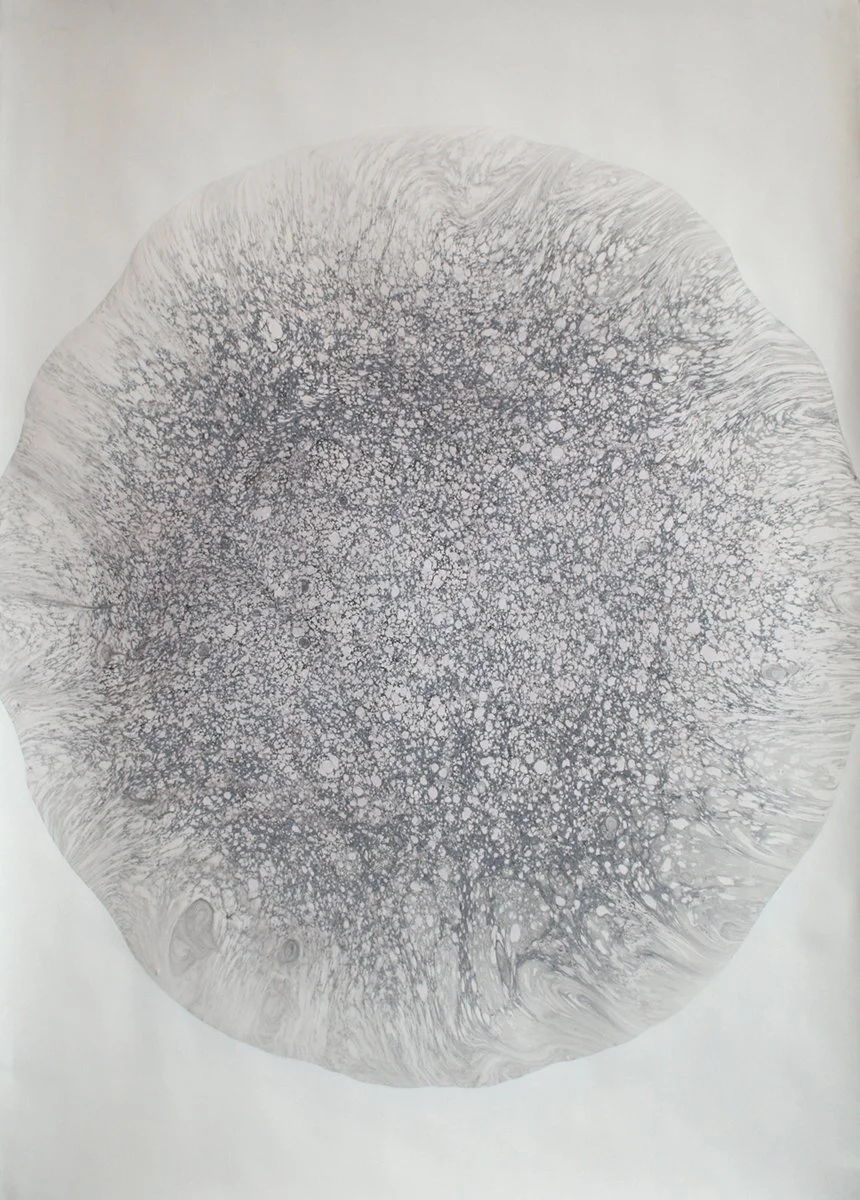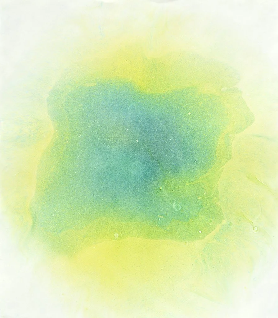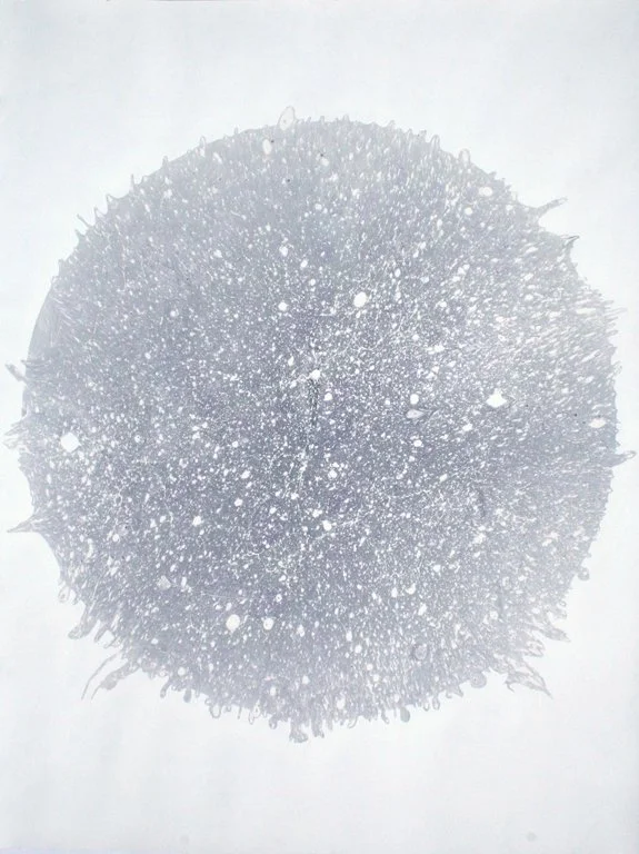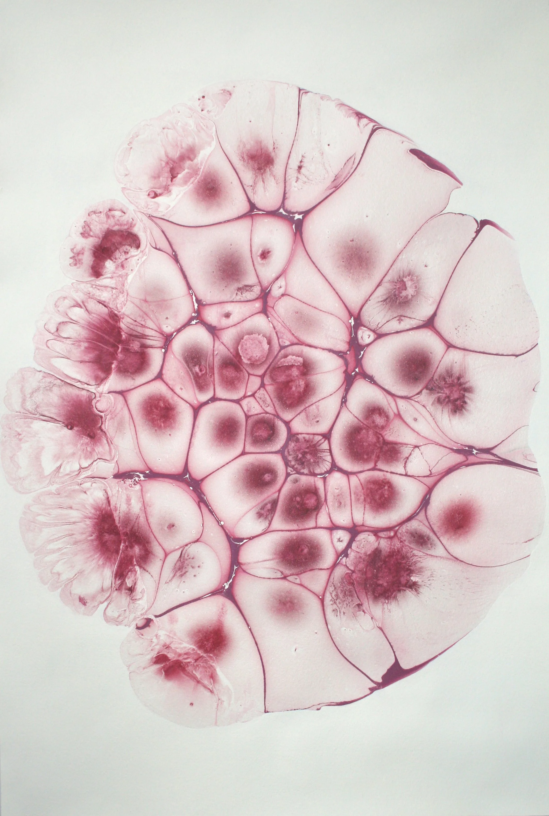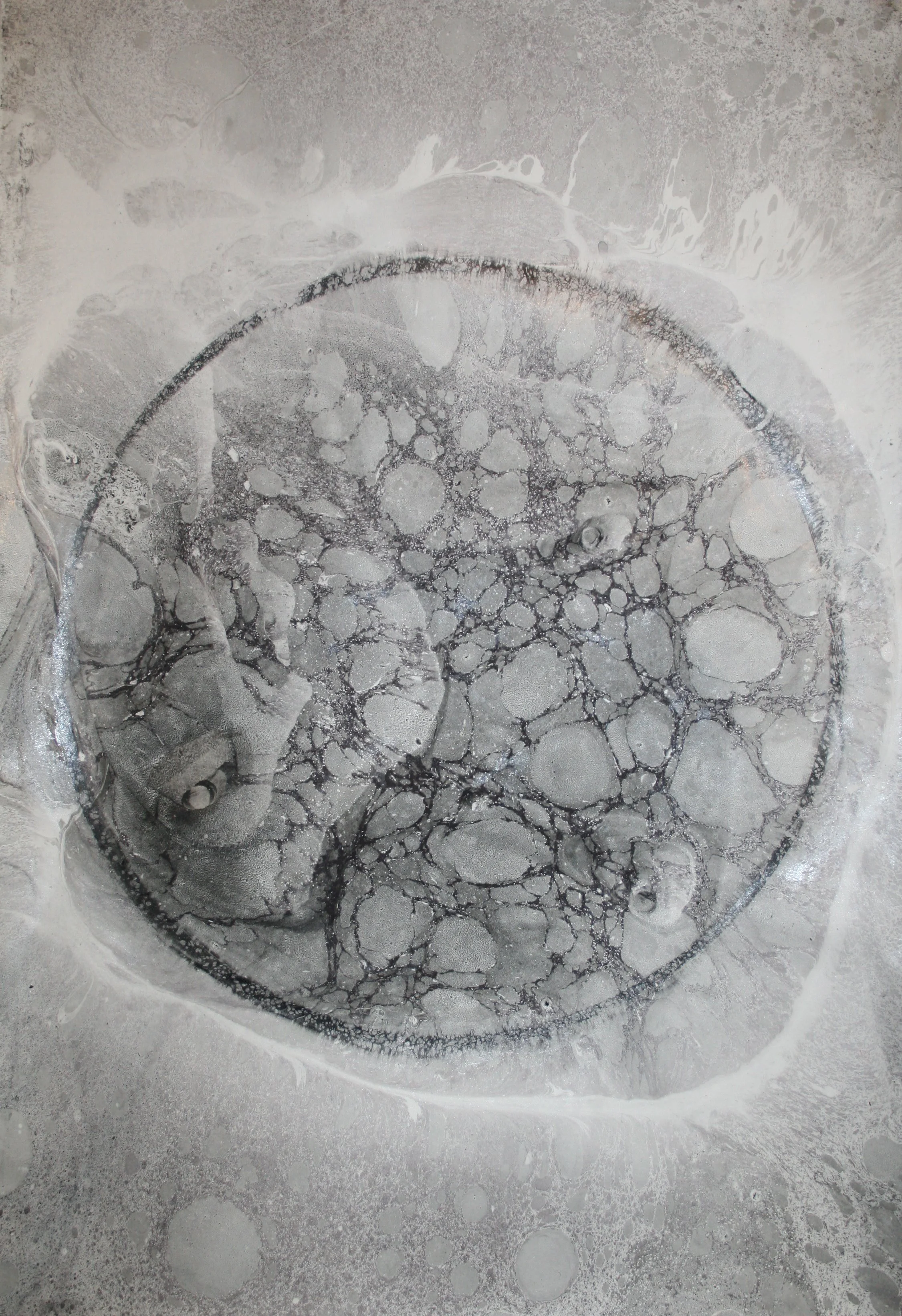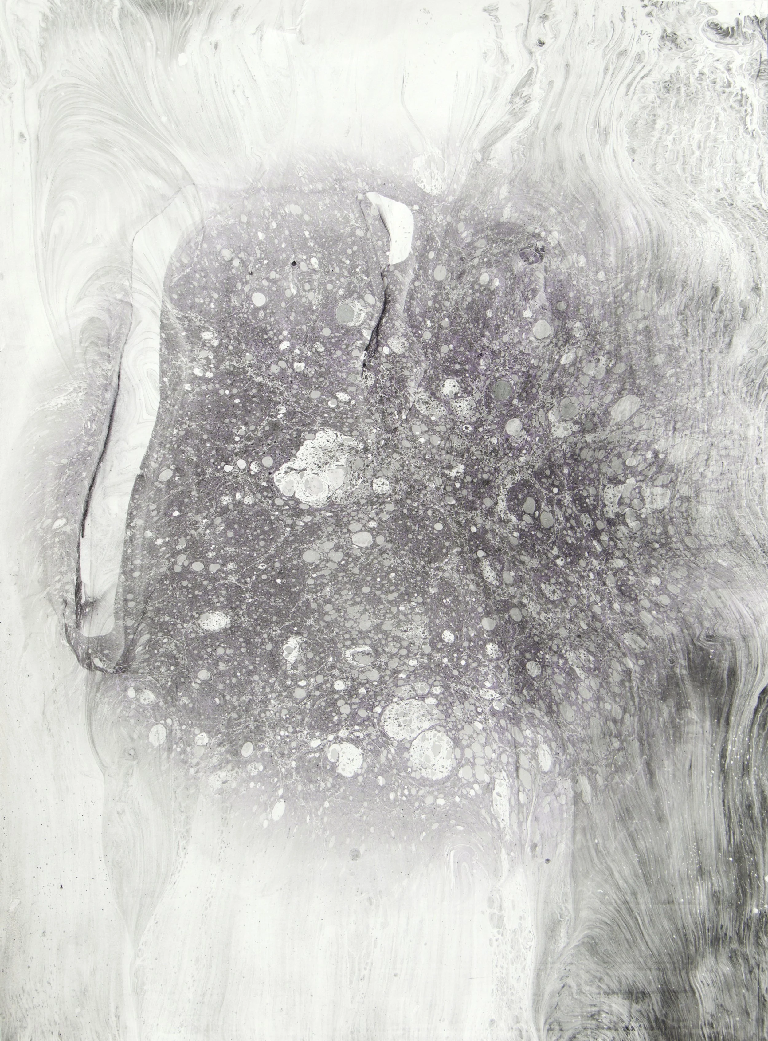 Julie’s work combines materials and methods from eastern and western marbling traditions, dating from the 12th century, with western approaches to painting. Water, pigment, and breath are used to create each work. The process begins with drops of acrylic paint on a liquid bath. The paint is induced to spread, move, and fragment by successive layers of paint and surfactants. The “floating painting” is then transferred to paper, and the final pieces are painted, and sometimes torn, cut and recombined.