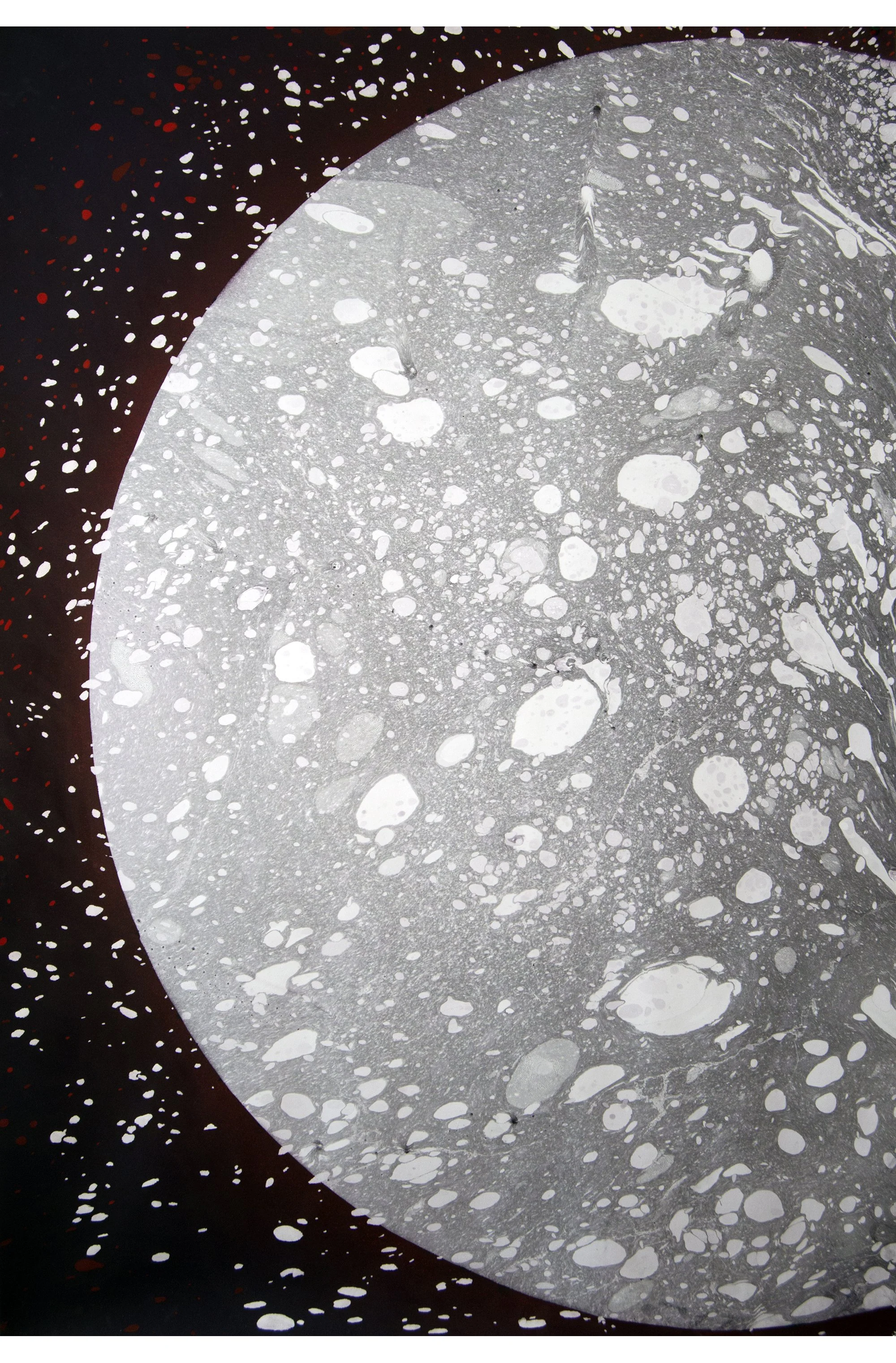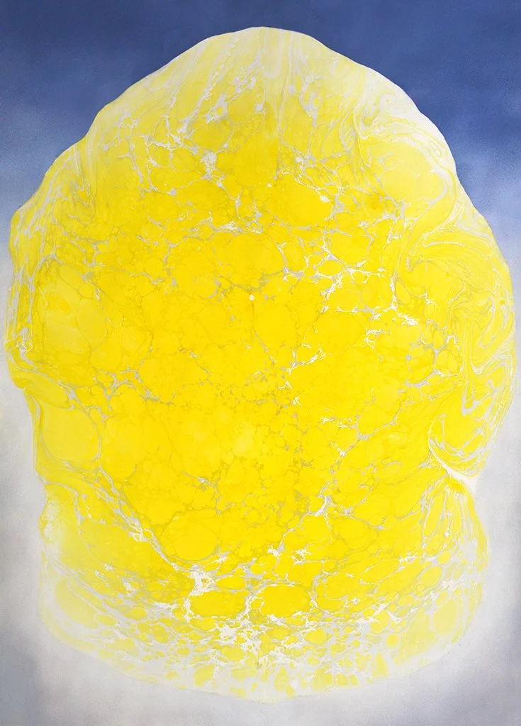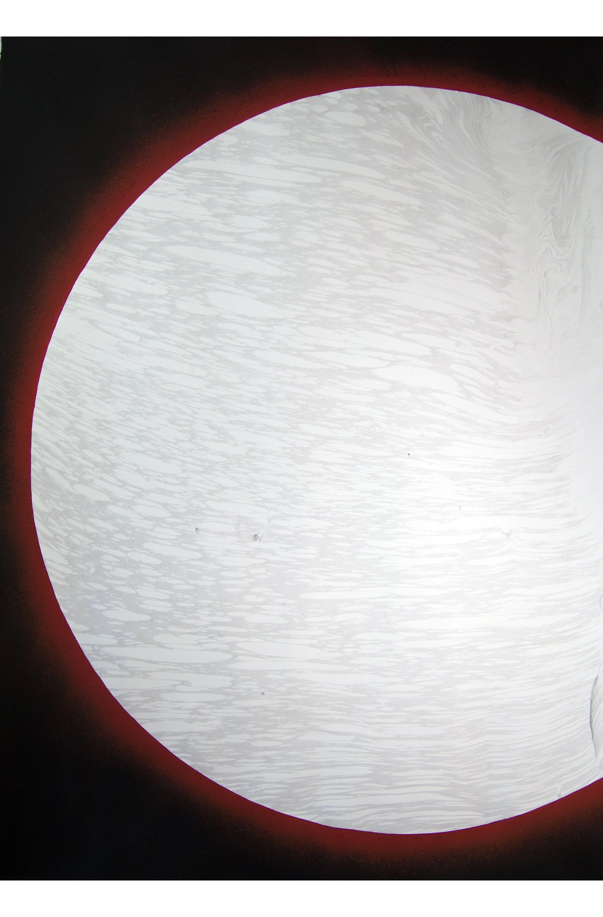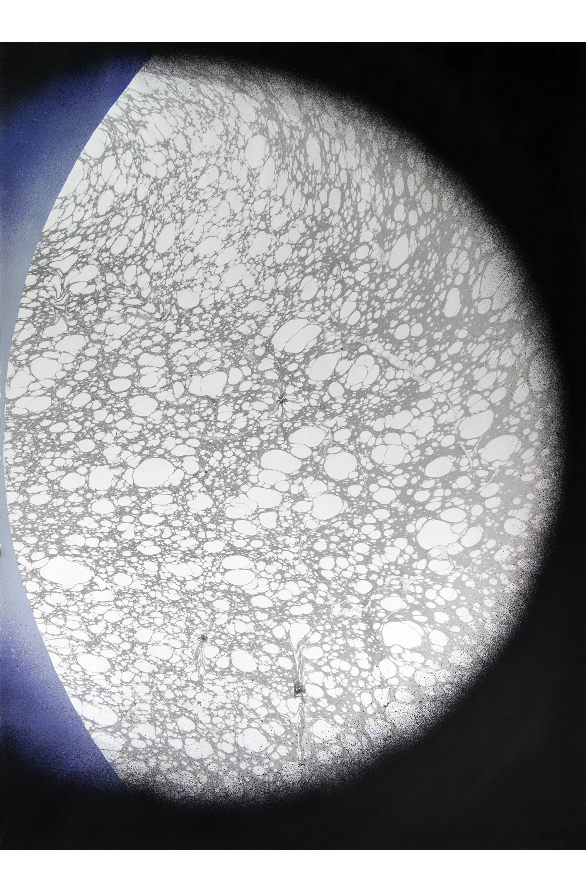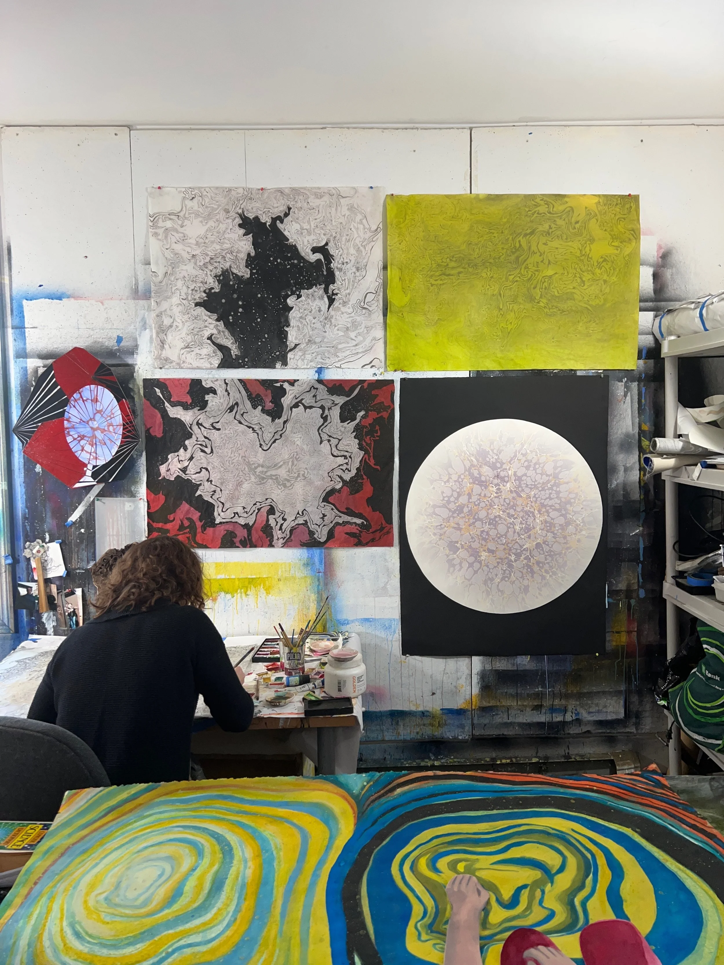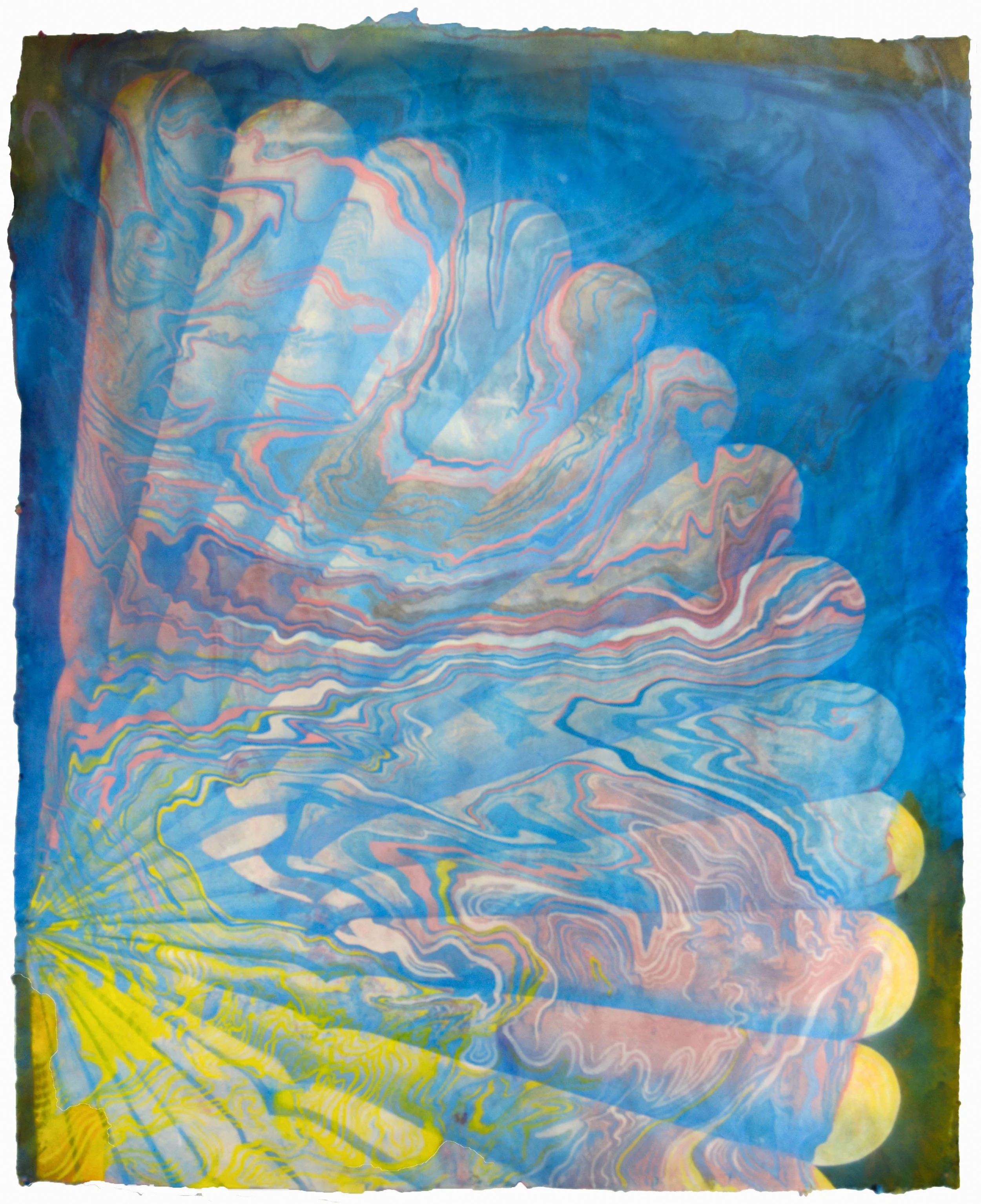 Julie’s work combines materials and methods from eastern and western marbling traditions, dating from the 12th century, with western approaches to painting. Water, pigment, and breath are used to create each work. The process begins with drops of acrylic paint on a liquid bath. The paint is induced to spread, move, and fragment by successive layers of paint and surfactants. The “floating painting” is then transferred to paper, and the final pieces are painted, and sometimes torn, cut and recombined.