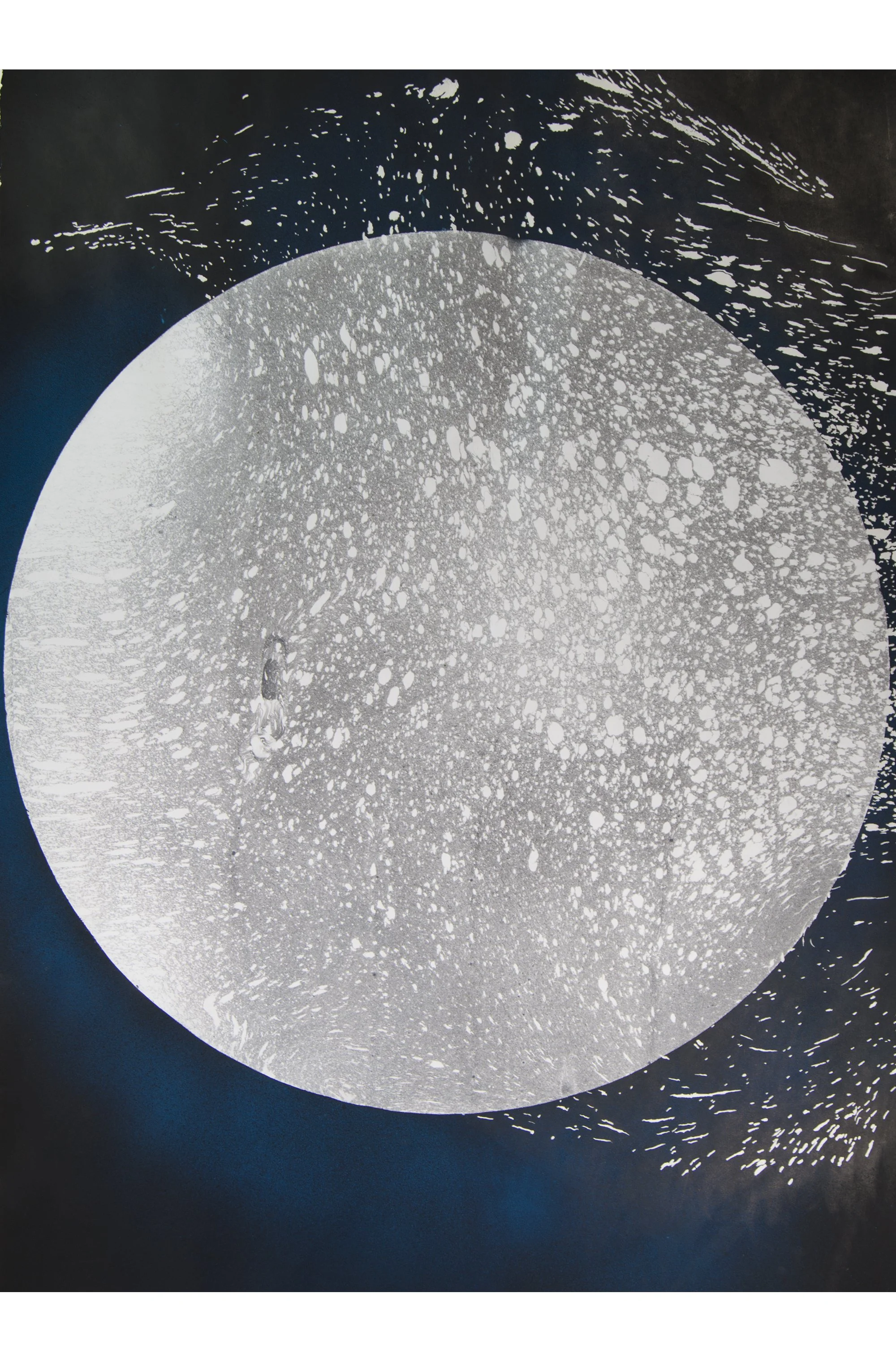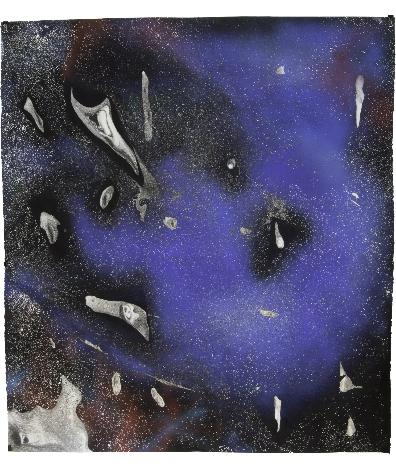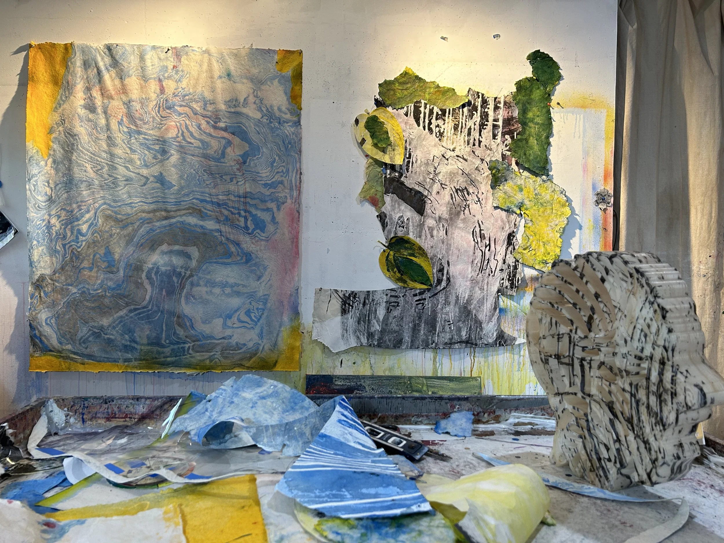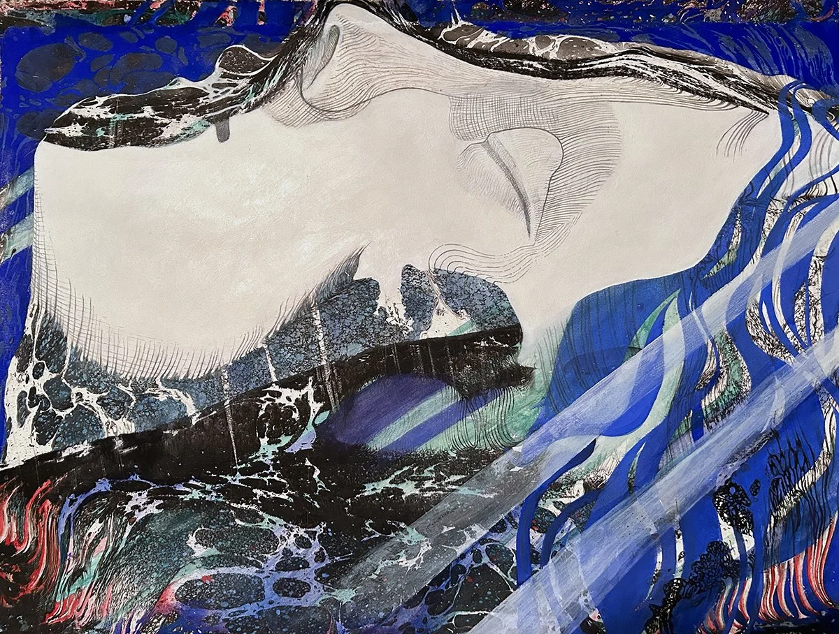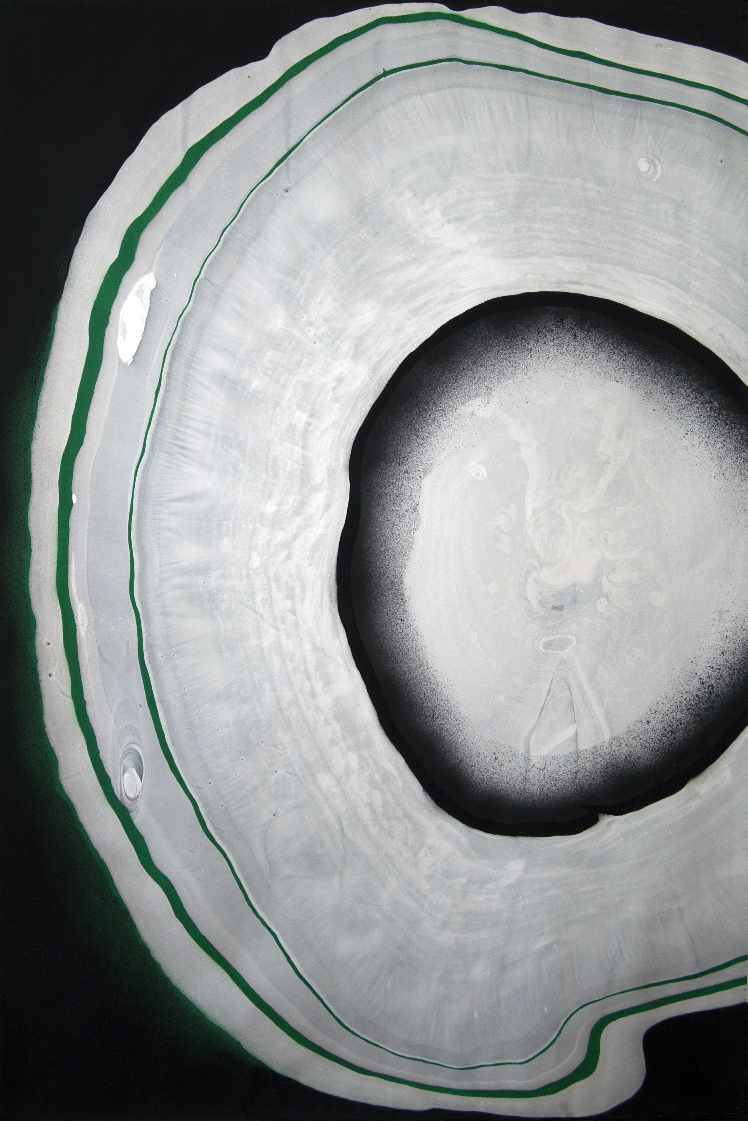 Julie’s work combines materials and methods from eastern and western marbling traditions, dating from the 12th century, with western approaches to painting. Water, pigment, and breath are used to create each work. The process begins with drops of acrylic paint on a liquid bath. The paint is induced to spread, move, and fragment by successive layers of paint and surfactants. The “floating painting” is then transferred to paper, and the final pieces are painted, and sometimes torn, cut and recombined.