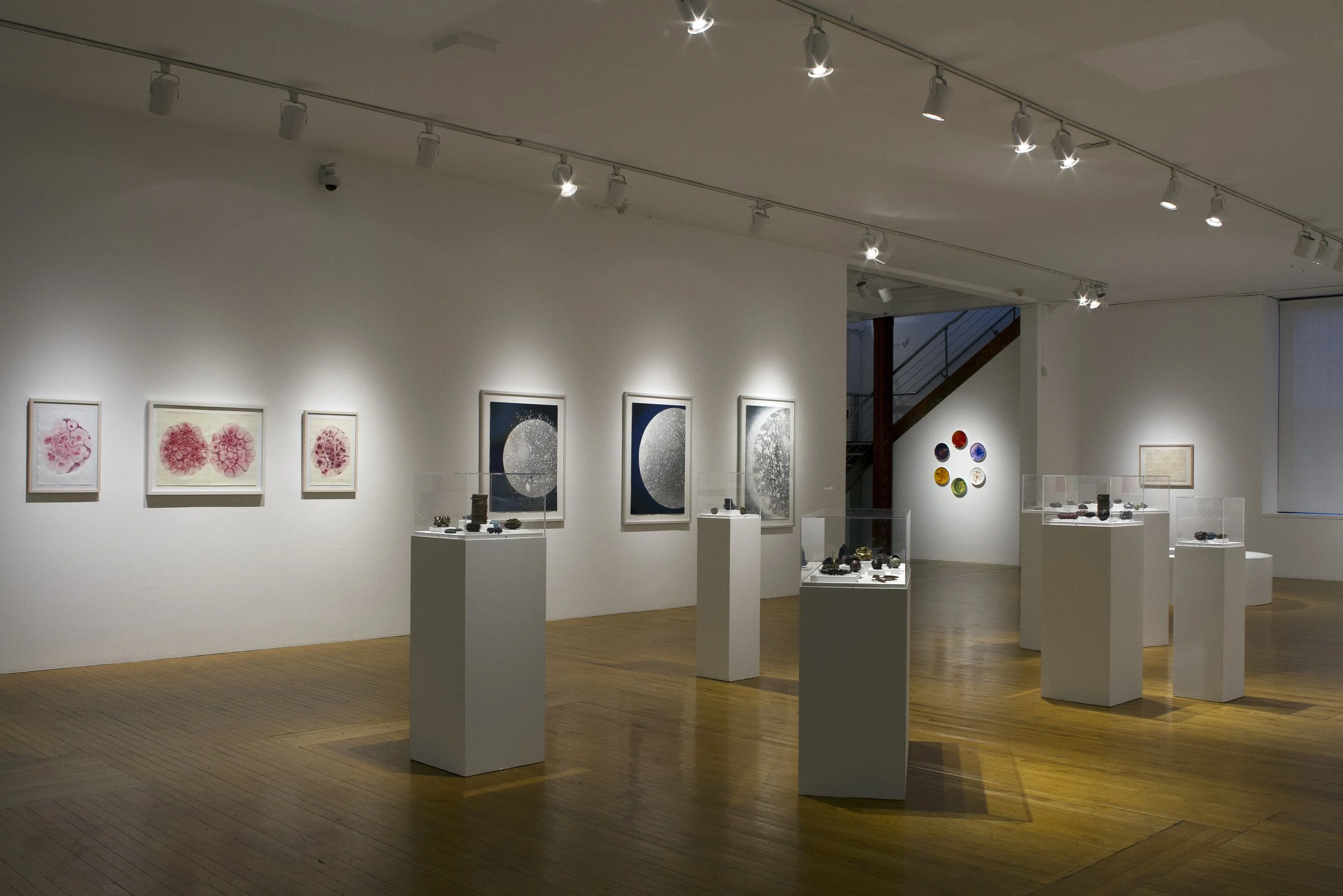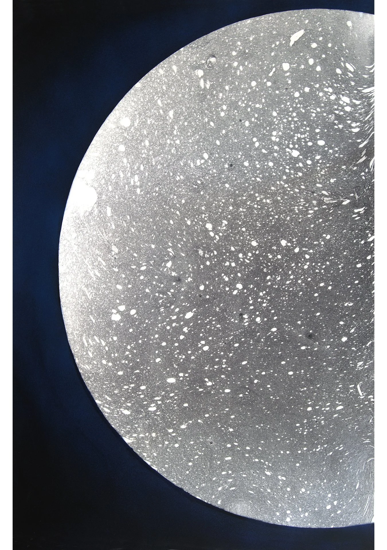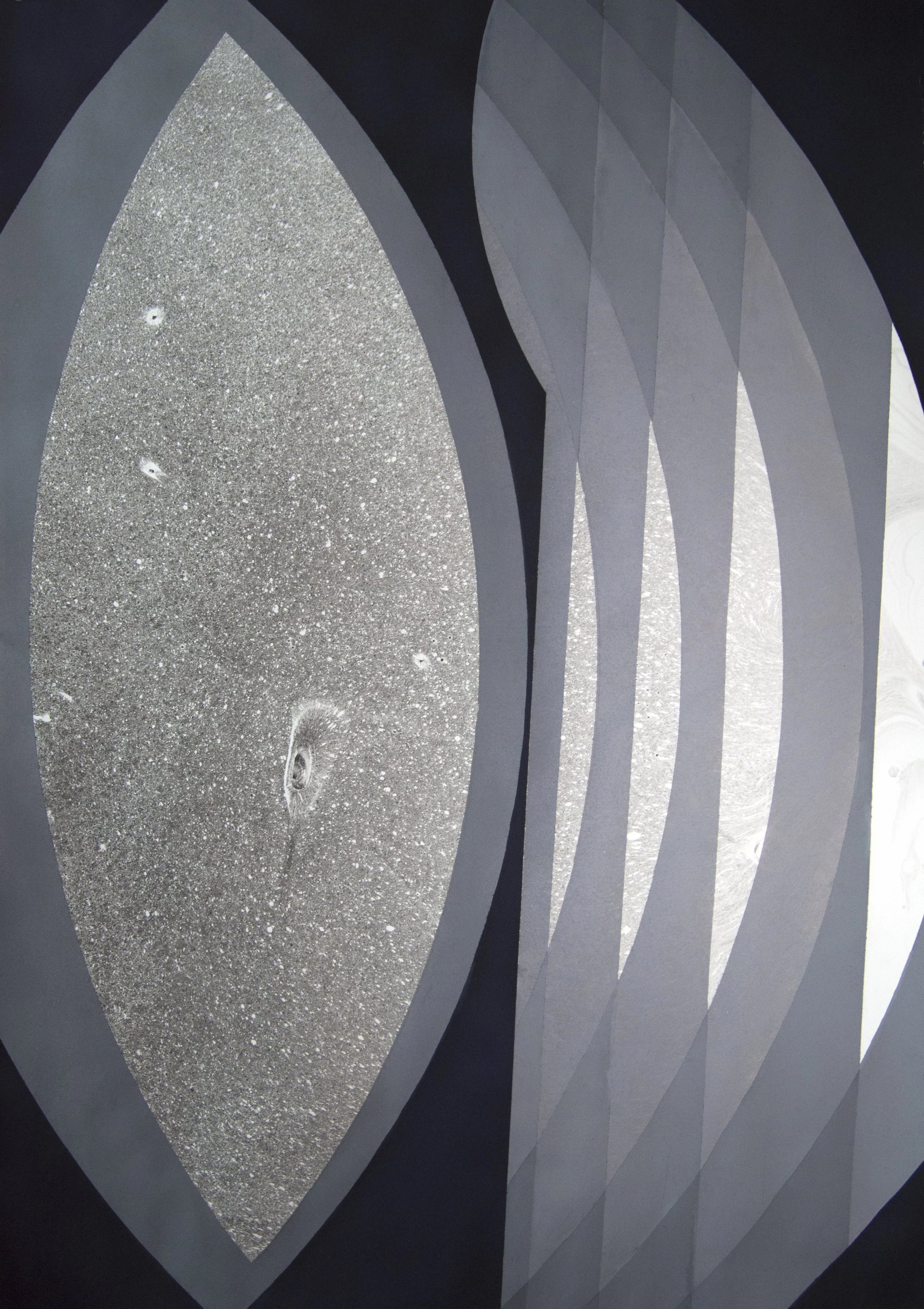 Her work includes references to NASA images, microscope photography, music, and humanist writing.