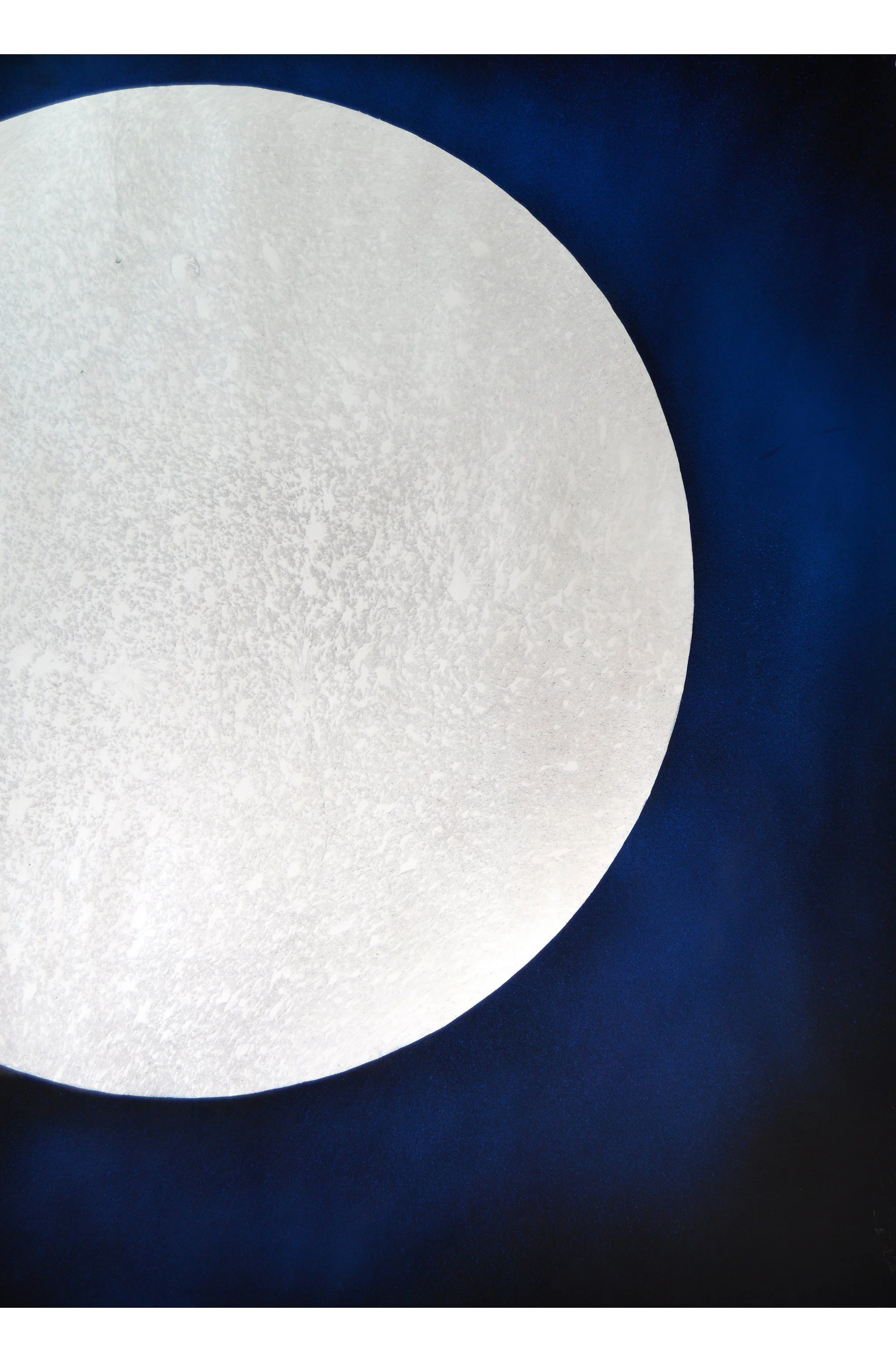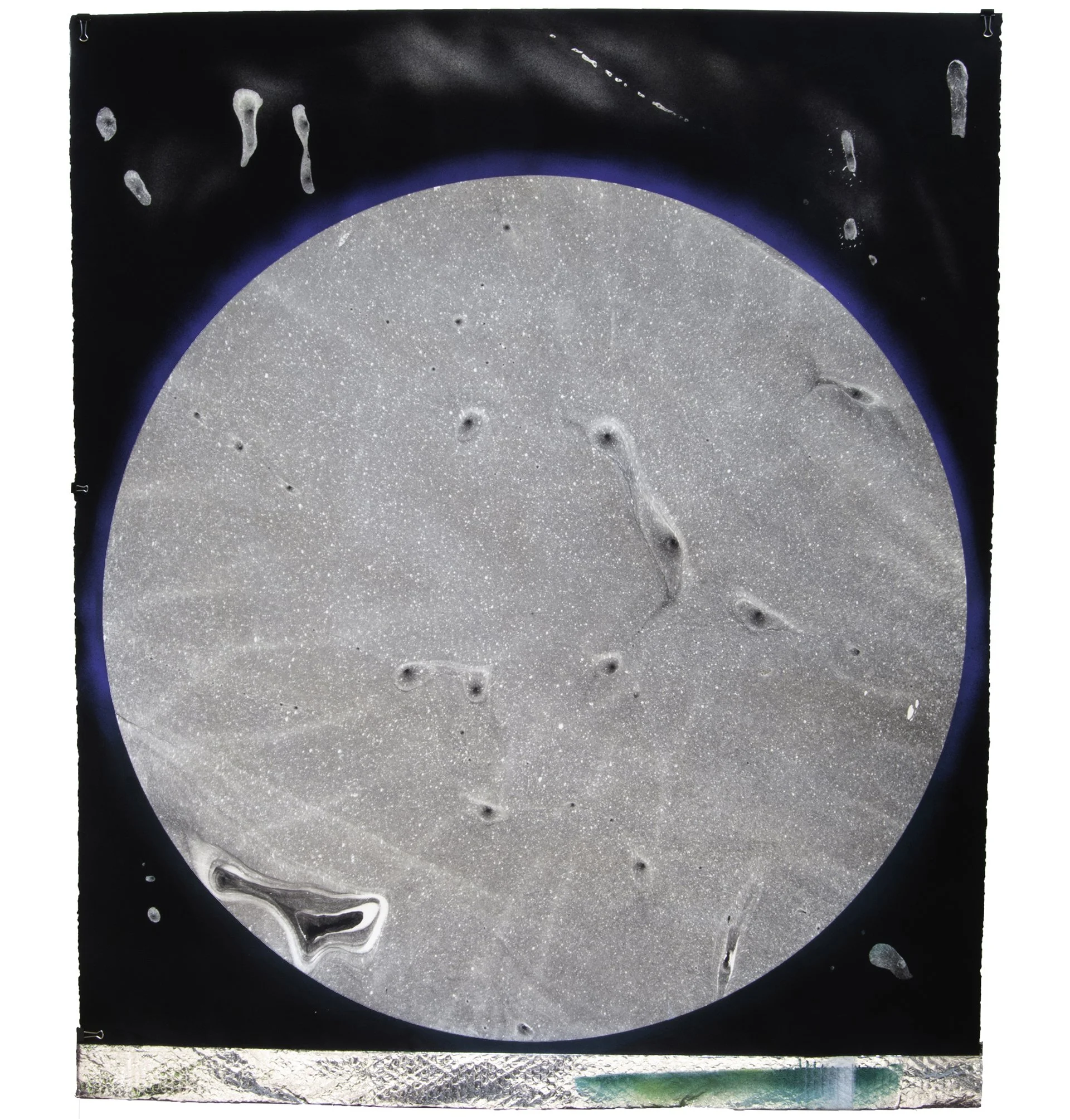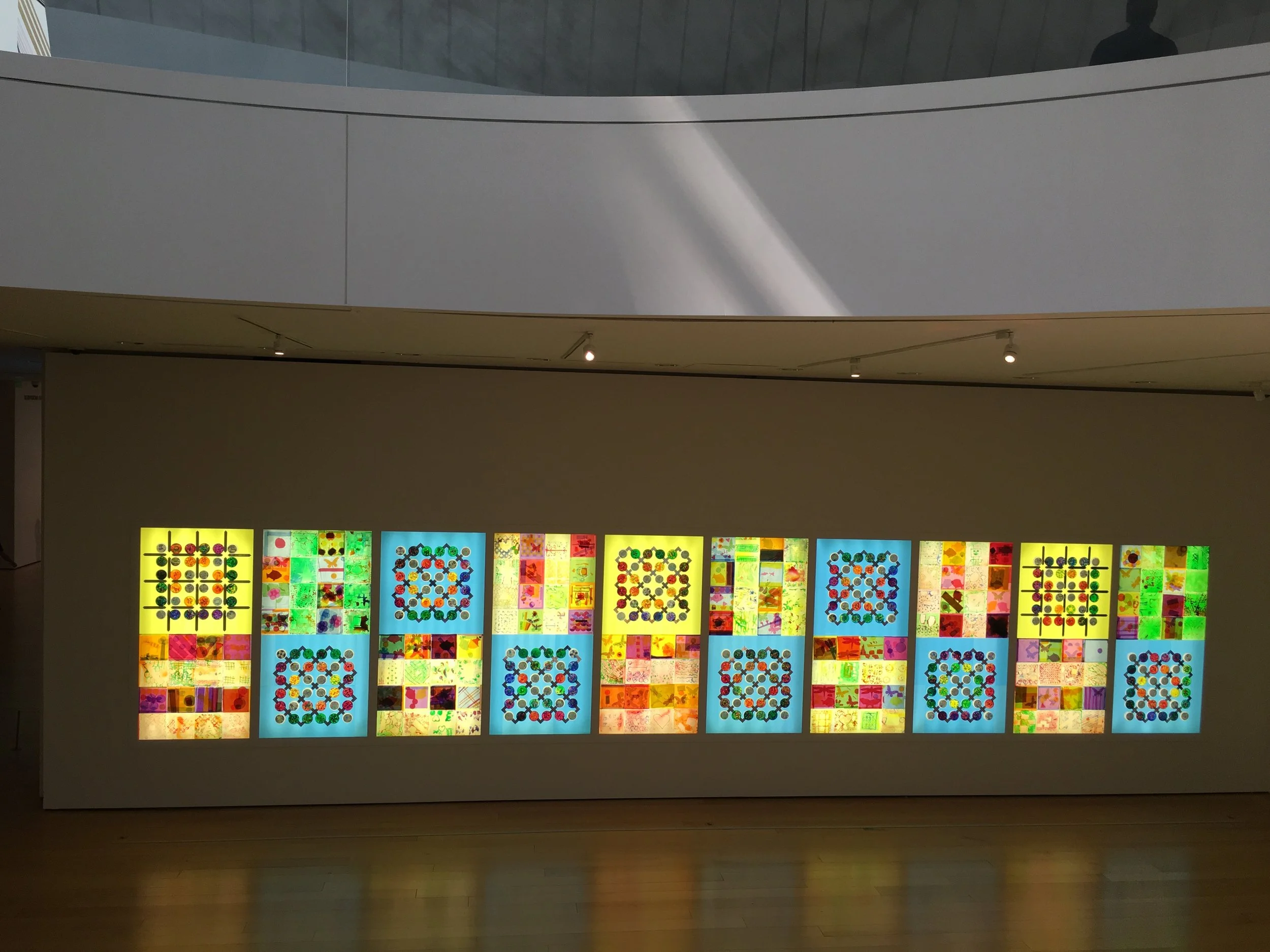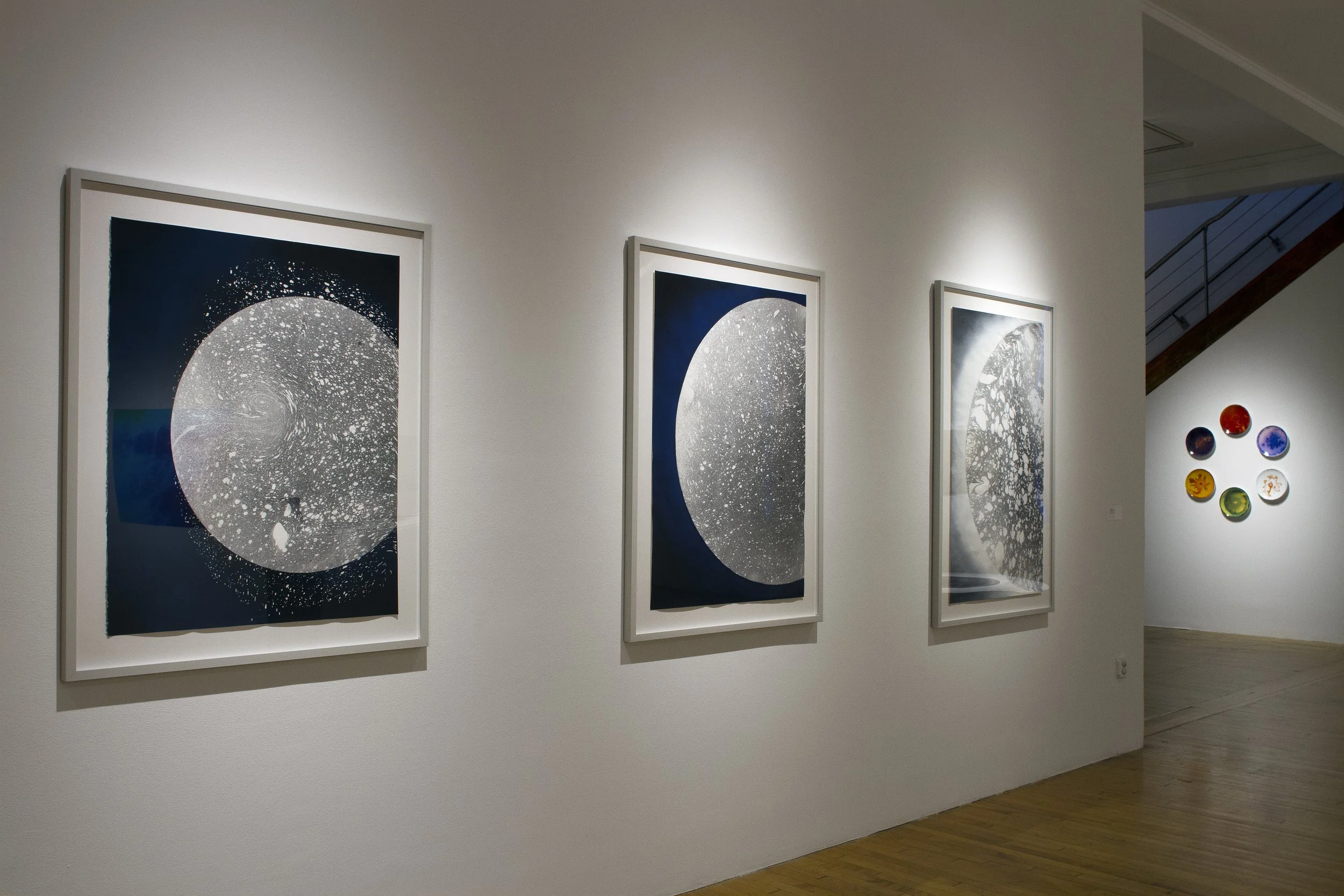 Her work includes references to NASA images, microscope photography, music, and humanist writing.